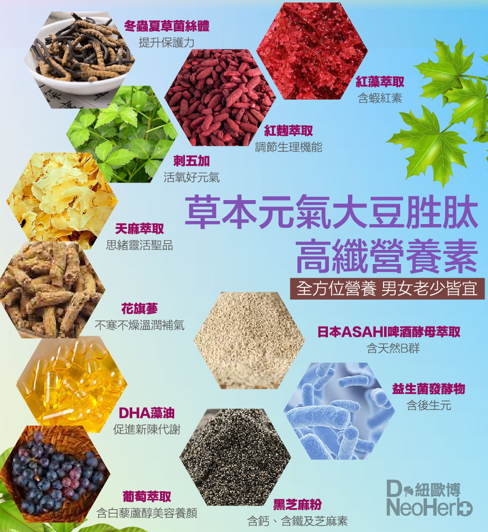 大豆蛋白x冬蟲夏草x刺五加x天麻x花旗蔘xDHA藻油