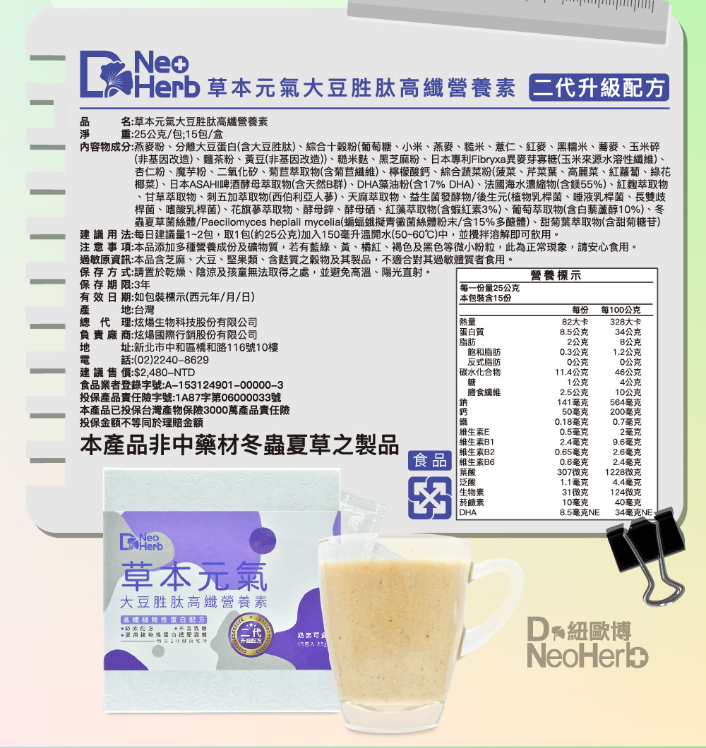 【紐歐博】草本元氣大豆胜肽高纖營養素-二代升級配方(12包/盒)